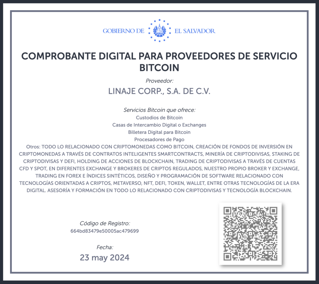 Linaje Corp SA de CV, es una Startup de Tecnología Blokchain, Registrada desde el 3 de Mayo del 2022, bajo el No 2022105414 en el CNR en El País de El Salvador. Bajo la Ley Bitcoin nos encontramos registrados como Proveedores de servicio Bitcoin en El Banco Central de Reserva.